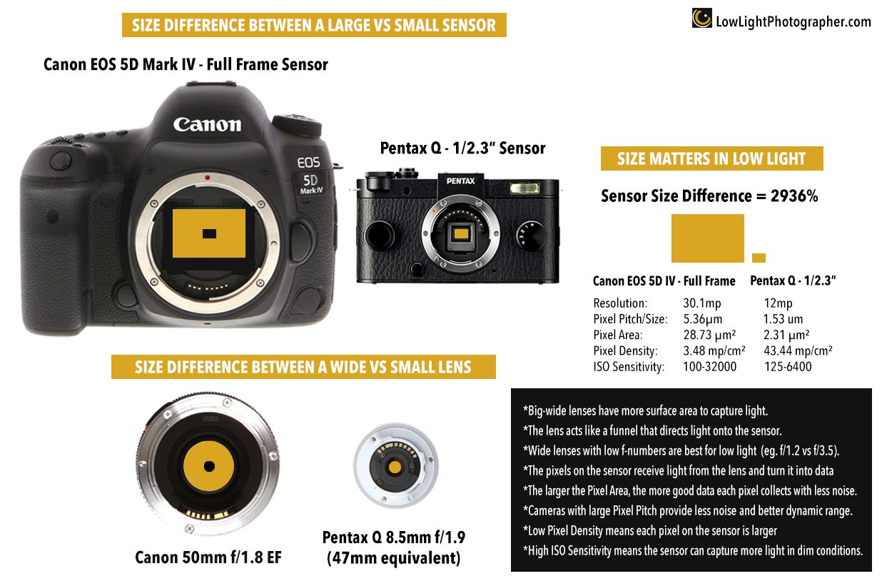 These settings are only possible with cameras that have large sensors and physically wide lenses. Size and settings matter in low light. The main difference between a compact camera and full frame camera is their low light performance due to the size difference between their sensors and lenses.